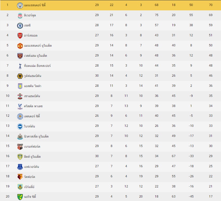 ผลการแข่งขันฟุตบอลพรีเมียร์ลีก และสรุปตารางคะแนน