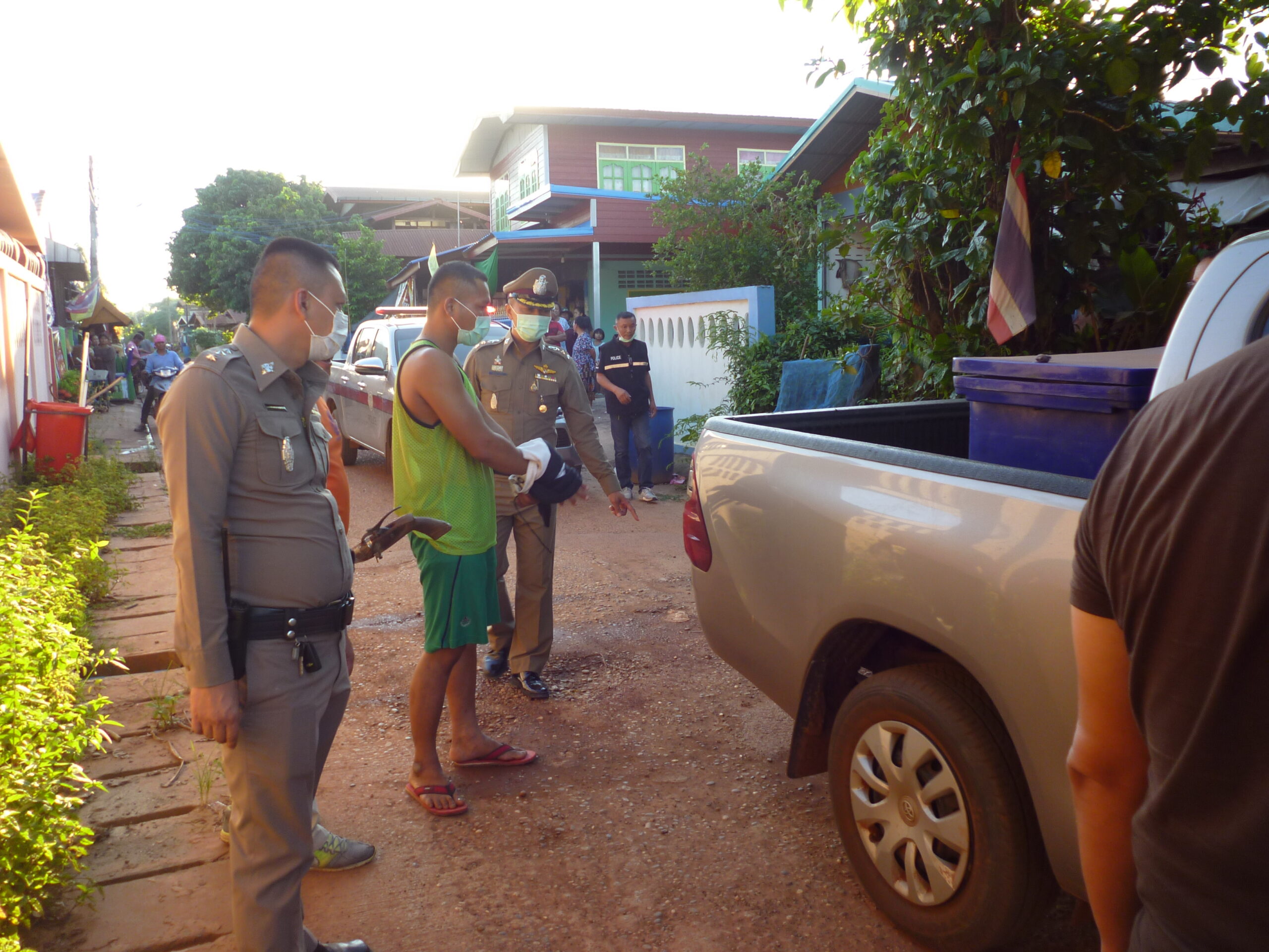 วันที่ 23 มิถุนายน 2563 เวลา 09.00 น. ร.ต.อ.สายัณห์ เหล่าเสน รอง สว.สอบสวน สภ.สร้างคอม จ.อุดรธานี ปฏิบัติหน้าที่อยู่บนโรงพัก ได้มีนายพวงพันธ์ ประเสริฐนอก อายุ 33 ปี อยู่บ้านเลขที่ 282 หมู่ 8 บ้านนาน้ำชุ่ม ต.บ้านโคก อ.สร้างคอม จ.อุดรธานี ขับรถปิกอัพฟอร์ด เรนเจอร์ สีส้ม ทะเบียน ขข 2095 อุดรธานี มาจอดหน้าโรงพัก ก่อนจะเดินขึ้นไปมอบตัว พร้อมของกลางถืออาวุธปืนไทยประดิษฐ์ หลังก่อเหตุยิงนายจิรายุ สุขเสริม อายุ 43 ปี พี่ชายที่มีอาการทางจิตประสาท คุ้มคลั่ง ถือมีดไล่ฟัน เสียชีวิตกลางถนนในหมู่บ้านนาน้ำชุ่ม เมื่อเวลา 14.00 น. วันที่ 22 มิถุนายน 2563