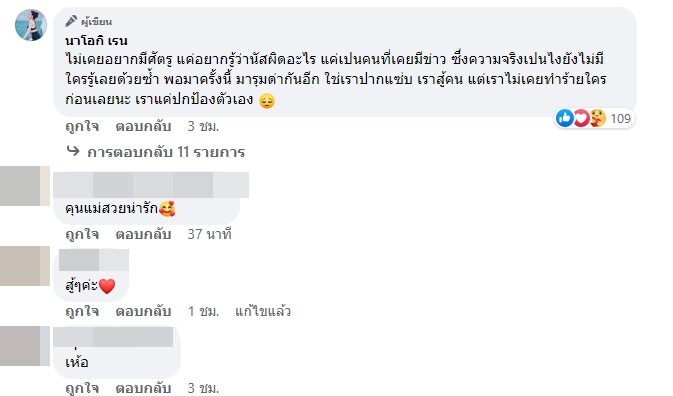 “เราไม่เคยอยากได้เงินจากใครเลย เราแค่อยากให้ทุกคนรู้ว่าแค่เรามีเน็ตในมือถือไม่ใช่ว่าเราจะโพสต์&เมนต์ด่าใครก็ได้ แล้วพวกที่ด่าลามถึงลูกในท้อง ไม่ต้องห่วงค่ะ นอกจากรักผัวมาก เราก็รักลูกมากเช่นกัน! ที่เหลือก็ให้เป็นเรื่องของกฏหมาย ขอบคุณมากค่ะพี่เจมส์”