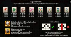 ตารางการจ่ายเงินซึ่งสัญลักษณ์จะแสดงเป็นไทล์ที่คุณจะพบในเกมไพ่นกกระจอก โดยเป็นการผสมผสานระหว่างหิน ตัวละคร ไม้ไผ่ ดอกไม้ และชุดเกียรติยศ โดยมังกรจะเป็นสัญลักษณ์ที่ให้ผลตอบแทนสูงสุดที่5 เท่าหากคุณจับคู่ได้สำเร็จ 5 อันบนรีล เกมยังมาพร้อมกับสัญลักษณ์เสริมซึ่งก็คือแพนด้า สัญลักษณ์นี้ไม่มีมูลค่าทางการเงินเมื่อปรากฏ แต่สามารถแทนที่สัญลักษณ์ทั่วไปทั้งหมดได้